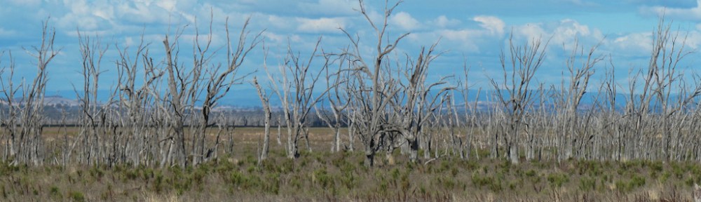 The wetlands were previously flooded to form Lake Mokoan. The lake was drained to restore the site, fully exposing the remnant dead trees.